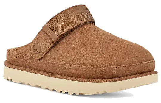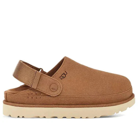 The Goldenstar Clog offers a modern twist on the traditional clog silhouette, with its chestnut colorway adding a warm, earthy tone that pairs well with a variety of outfits. The durable rubber outsole ensures that this clog is suitable for both indoor and outdoor wear, while the sheepskin lining provides that signature UGG coziness.